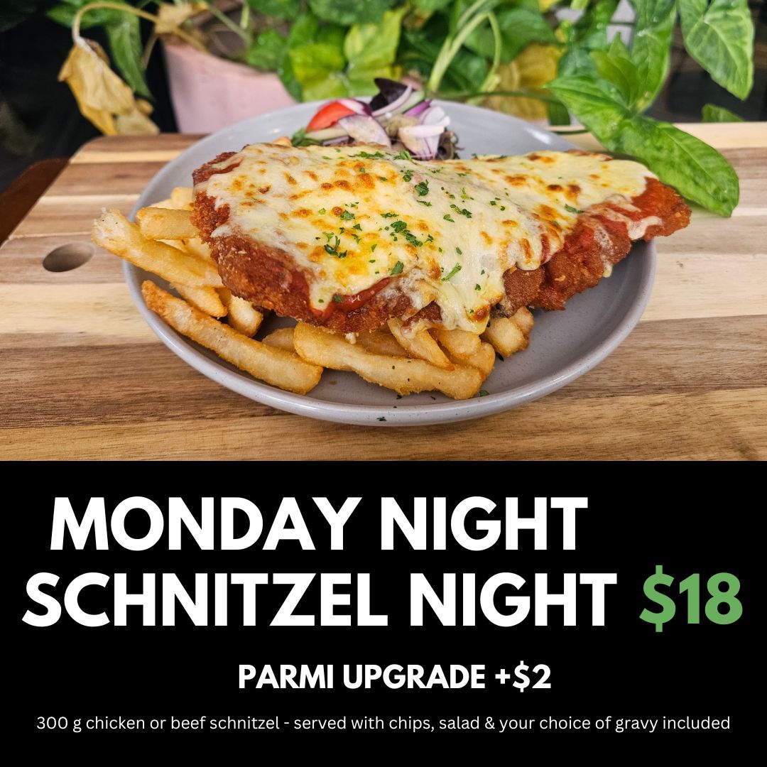 Choice of 300g chicken or beef schnitzel served with chips, salad & your choice of gravy for $18 - or upgrade to a parmi for an extra $2! 🍽️